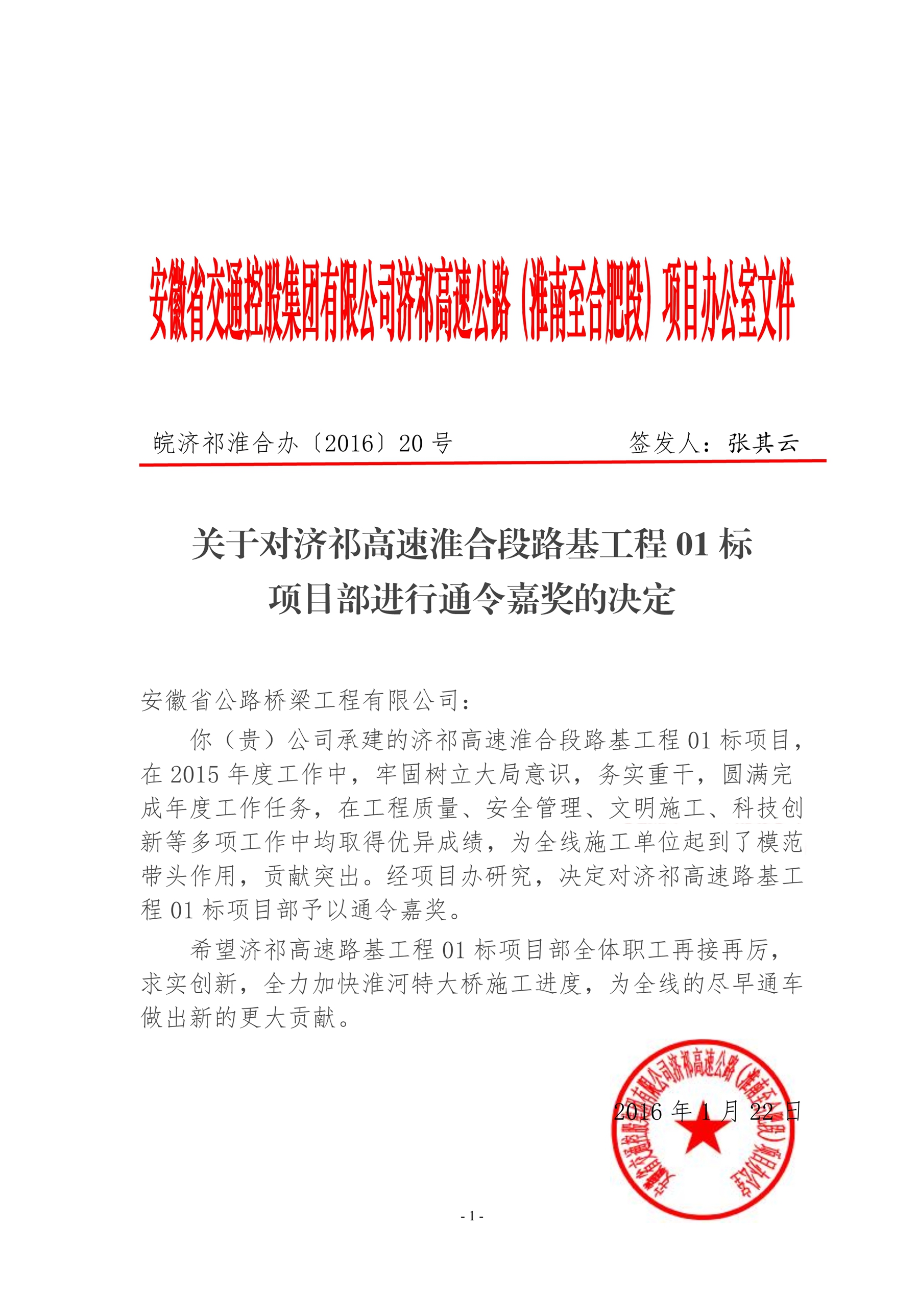 1月22日,安徽省交通控股集團(tuán)發(fā)來嘉獎(jiǎng)令,對(duì)公司承建的濟(jì)祁高速淮合段路基工程01 標(biāo)項(xiàng)目通令嘉獎(jiǎng)。