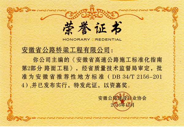 會上,省交通廳對在系列指南編寫工作中作出貢獻(xiàn)的單位和個人給予了表彰并頒發(fā)榮譽(yù)證書。公司主編的 《安徽省高速公路施工標(biāo)準(zhǔn)化指南 第2部分路面工程》(DB 34/T 2156-2014)獲得表彰,并經(jīng)省質(zhì)量技術(shù)監(jiān)督局審定批準(zhǔn)為安徽省推薦性地方標(biāo)準(zhǔn),發(fā)布實行。