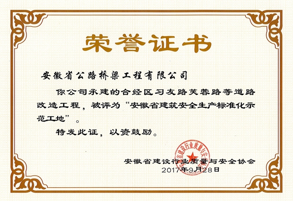 這是公司自去年開(kāi)全省市政路橋工程先河,一次性獲得五個(gè)省級(jí)安全標(biāo)準(zhǔn)化示范工地后,再次獲得這一榮譽(yù)。