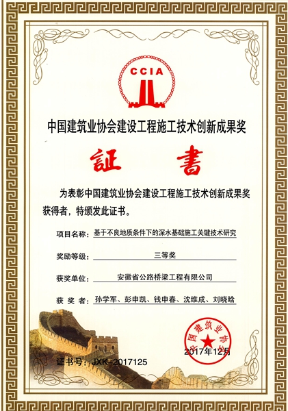 日前,中國建筑業(yè)協會公布了2017年建設工程施工技術創(chuàng)新成果獲獎名單,公司組織申報的《基于不良地質條件下的深水基礎施工關鍵技術研究》榮獲三等獎。