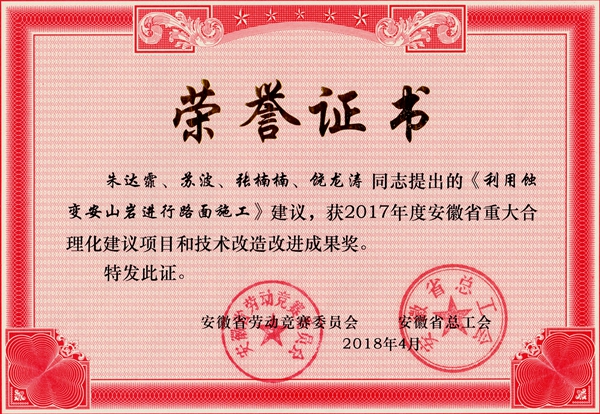 公司14項(xiàng)合理化建議榮獲“安徽省重大合理化建議項(xiàng)目和技術(shù)改造改進(jìn)成果獎”