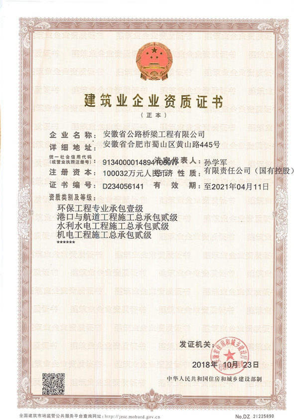 10月23日,公司環(huán)保工程專業(yè)承包壹級、水利水電工程施工總承包貳級、機電工程施工總承包貳級三項資質(zhì)順利通過安徽省住房和城鄉(xiāng)建設(shè)廳審查核準。三項新資質(zhì)的取得為公司進一步拓展非公路施工業(yè)務(wù),實現(xiàn)經(jīng)營業(yè)務(wù)多領(lǐng)域發(fā)展打下了基礎(chǔ)。