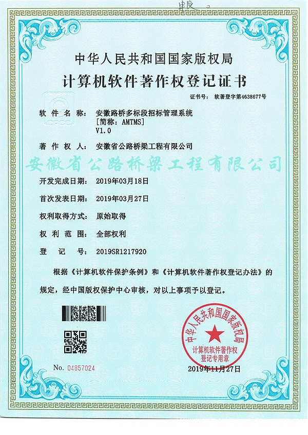 近日,《安徽路橋多標段招標管理系統(tǒng)V1.0》《安徽路橋關鍵績效考核管理系統(tǒng)V1.0》等五項管理系統(tǒng)取得國家版權局頒發(fā)的計算機軟件著作權。
