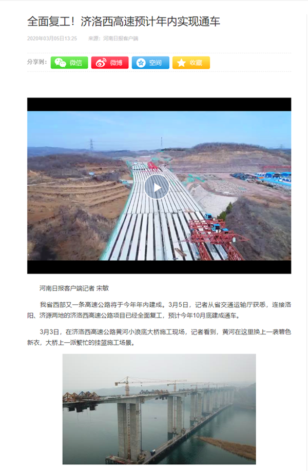 3月4日,公司承建的巢湖亞父路項目裕溪河大橋復(fù)工場景出現(xiàn)在人民網(wǎng)首頁,并刊文指出,為奪回疫情造成的停工損失,項目部嚴格落實防疫和生產(chǎn)要求,在保證安全質(zhì)量的前提下,加班加點趕施工進度,確保大橋按期建成通車。河南衛(wèi)視、鳳凰網(wǎng)等多家媒體記者走進公司承建的濟洛西高速黃河特大橋項目施工現(xiàn)場,實地采訪項目復(fù)工復(fù)產(chǎn)情況,并在中國網(wǎng)、河南日報客戶端、大河網(wǎng)進行了登載。安徽網(wǎng)聚焦G318池州至殷匯段改建工程復(fù)工建設(shè),《今日宣州》以《按下交通建設(shè)“快進鍵”》為題專題報道了公司宣城PPP項目在疫情防控形勢逐漸向好的態(tài)勢下,搶抓建設(shè)黃金期,優(yōu)化調(diào)整復(fù)工隊伍和施工組織計劃,把因疫情耽誤的工期搶回來,確保項目如期完工,開啟了復(fù)工建設(shè)趕進度模式。