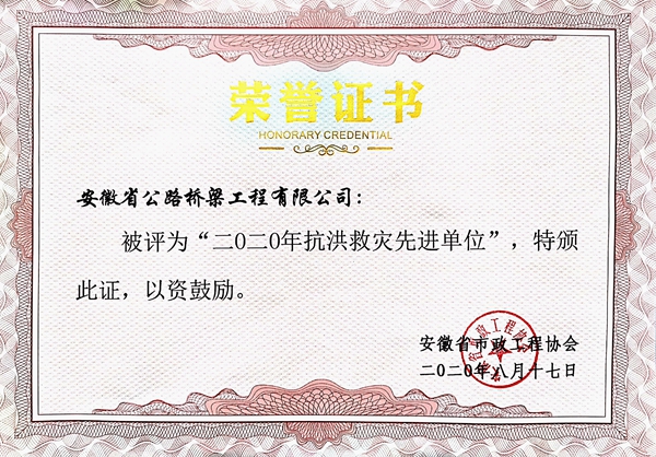 近日,安徽省市政工程協會發布《關于表彰2020年抗洪救災先進單位的決定》,對今年6月以來積極投身抗洪救災一線表現突出的會員單位進行表彰。公司獲評“2020年抗洪救災先進單位”。