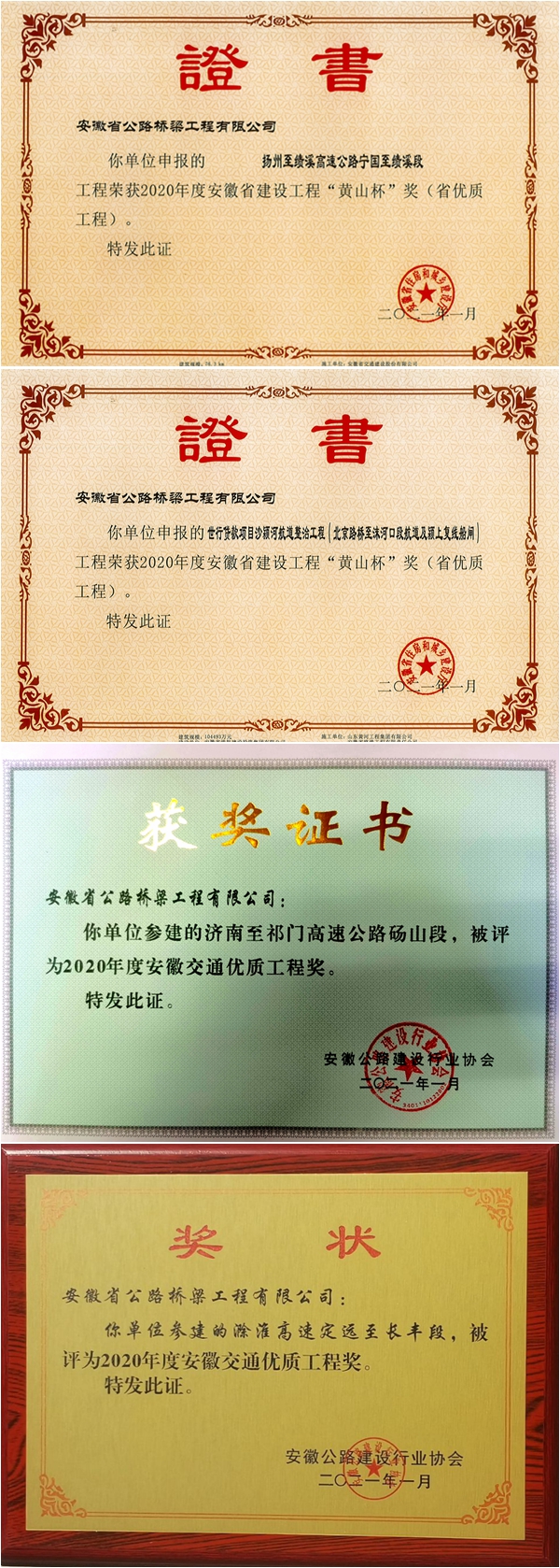 近日,2020年安徽省建設工程“黃山杯”和2020年度安徽交通優(yōu)質(zhì)工程獎在合肥頒獎。公司承建的揚績高速公路寧國至績溪段路基07標、沙潁河航道(北京路橋至沫河口段航道及潁上復線船閘)整治工程06標榮獲2020年安徽省建設工程“黃山杯”。滁淮高速公路定遠至長豐段路基05標、路面02標,濟祁高速碭山段項目榮獲2020年度安徽交通優(yōu)質(zhì)工程獎。
