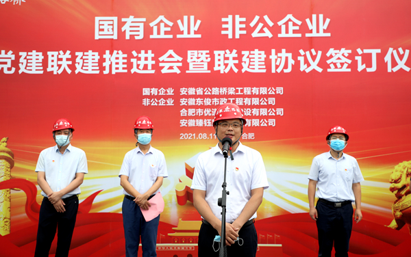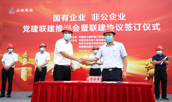 會上宣讀了公司《國有企業(yè)與非公企業(yè)黨建聯(lián)建試點方案》和《關(guān)于成立南二環(huán)黨員聯(lián)合突擊隊、黨員聯(lián)合攻關(guān)小組、劃分黨員責(zé)任區(qū)的通知》,并給聯(lián)合攻關(guān)小組、聯(lián)合突擊隊授牌、授旗。錢申春代表公司黨委分別和安徽東俊市政工程有限公司、安徽臻鈺路橋工程有限公司、合肥市優(yōu)道市政建設(shè)有限公司三家非公企業(yè)黨組織負(fù)責(zé)同志簽訂了《黨建聯(lián)建協(xié)議書》。