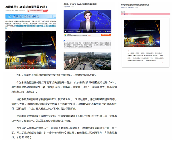 近日,人民網(wǎng)安徽頻道、合肥市廣播電視臺、合肥市人民政府等多家省市級主流媒體相繼報(bào)道了公司承建的郎溪路(裕溪路—明皇路)01標(biāo)項(xiàng)目建設(shè)情況。