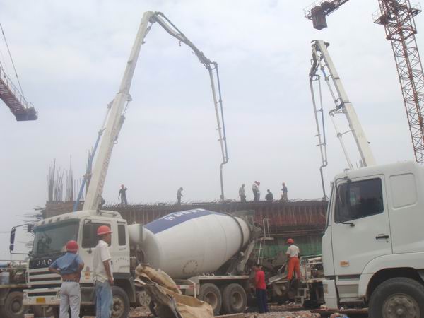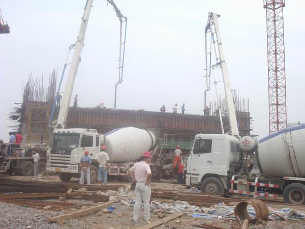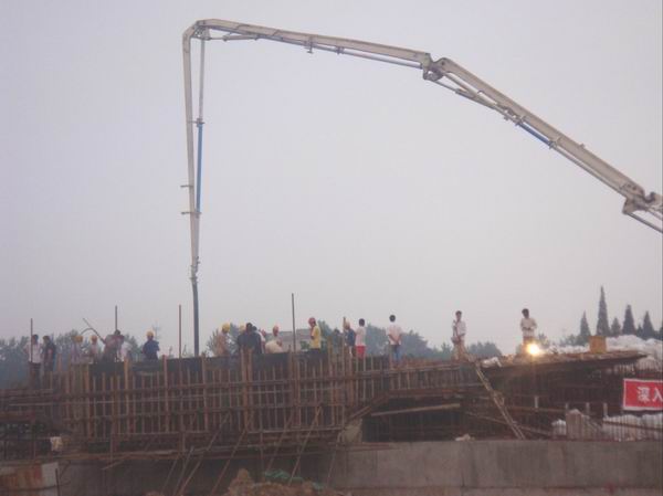 盛夏季節(jié),驕陽似火。經項目部科學組織、精心準備、合理安排,2009年6月21日上午六安市淠望路大橋工地上人頭攢動、機器轟鳴,兩臺混凝土泵車高高聳立在大橋主墩0#塊上面。九時許,經現場監(jiān)理組和業(yè)主驗收后,淠望路大橋主墩0#塊開始澆注混凝土,現場施工人員克服高溫酷暑天氣,經過個5個多小時的連續(xù)奮戰(zhàn),于當天下午三點順利完成混凝土的澆筑工作。