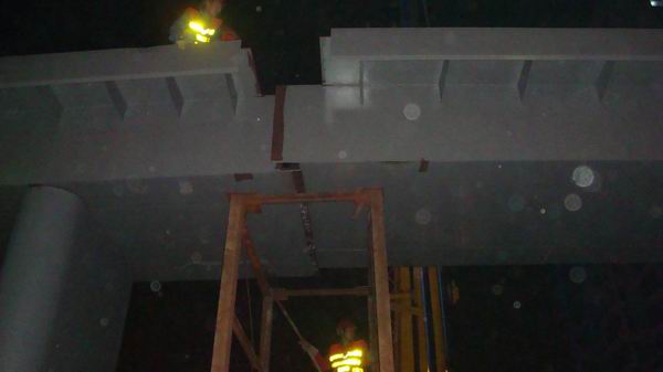 晚上21:30,運(yùn)梁車準(zhǔn)時(shí)將A梁運(yùn)達(dá)施工區(qū),隨即北一環(huán)南側(cè)在交警的協(xié)助下,按計(jì)劃全封閉。經(jīng)過近一個(gè)多小時(shí)的安裝,晚上23:00整,張洼路天橋施工區(qū)響起了一陣陣掌聲,禮炮隨后騰空燃起——A梁成功安裝了。B梁在隨后的3個(gè)小時(shí)內(nèi)也成功完成安裝。