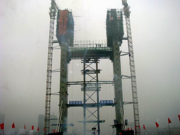 作為整座大橋的控制性工程,主索塔施工一直是各方關(guān)注的焦點(diǎn),并成為影響我項(xiàng)目總體施工進(jìn)度的主要因素。為此,項(xiàng)目部領(lǐng)導(dǎo)班子經(jīng)過多次研究分析并大膽決策,決定改變以前多點(diǎn)開花,齊頭并進(jìn)的工作方向,將工作重心向主索塔偏移,從人員到設(shè)備優(yōu)先滿足主索塔的施工需要。針對(duì)施工過程中遇到的技術(shù)難題,項(xiàng)目部及時(shí)邀請(qǐng)有關(guān)專家及公司領(lǐng)導(dǎo)到施工現(xiàn)場(chǎng)指導(dǎo),制定解決方案。在積極趕超進(jìn)度的同時(shí),項(xiàng)目部將安全和質(zhì)量擺放在首要位置。在施工過程中,項(xiàng)目部不僅建立了完善的安全、質(zhì)量保障體系,更積極增加投入,全方位確保主索塔施工質(zhì)量,并使主索塔施工速度得到穩(wěn)步提升。