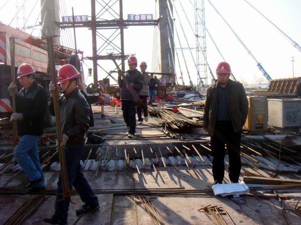 根據(jù)年前項目部會議計劃安排,節(jié)前應完成主跨掛籃懸澆塊第十節(jié)段的澆筑,然而由于年底大雪天氣影響,致使原計劃有所推遲。為搶回工期,正月初六項目部員工便全部到崗,立即展開謀劃,組織復工。由于作業(yè)隊外地工人過年回家未能及時全部到崗,項目部人員在江仲明經(jīng)理的率領下,親自下工地抬鋼筋、穿波紋管、綁扎鋼筋,干起了體力活,補上了未到崗工人的缺,使施工速度明顯加快。21日晚,在大家的共同努力下,主跨第十節(jié)段混凝土順利澆筑完畢。在節(jié)后的六安市建筑工地中我部率先完成了混凝土澆筑工作,在虎年的新春里開了一個好頭。六安市《大別山晨刊》報以《部分工人未到崗技術人員頂上去——新春伊始淠望路大橋搶抓工期》為題在頭版對我部的事跡進行了專題報道。