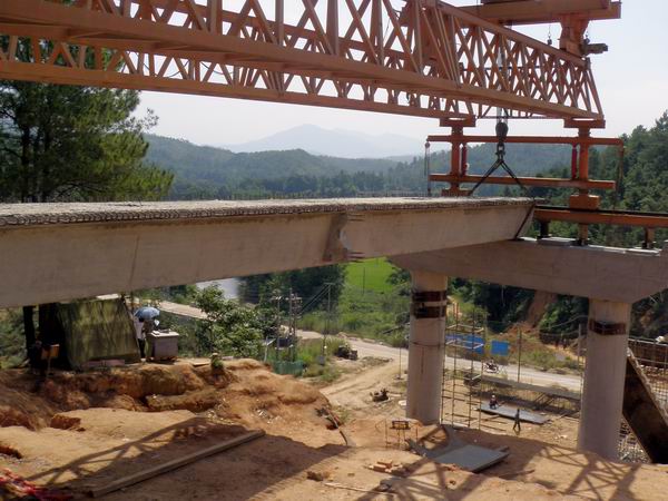 為了確保架梁工作的順利開展,項目部領導到現場指導架橋機的拼裝、檢驗等工作,通過對架梁人員進行分部分項技術交底,讓所有現場作業人員都能做到熟捻于心。經過施工人員精心施工,努力奮斗,于10月2日完成架橋機拼裝,10月3日完成調試。10月5日,在項目部領導、監理和駐地辦領導的共同指揮下,我標段首片箱梁成功架設。現場鞭炮齊鳴,掌聲如雷,為國慶增添新的喜慶。