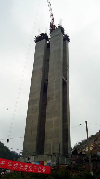 巖子腳特大橋?yàn)檫B續(xù)性剛構(gòu)橋,兩主墩之間跨度160米。主橋左、右幅均為混凝土連續(xù)箱梁,是水盤線幾個重點(diǎn)控制工程之一,也是影響我項(xiàng)目工期的關(guān)鍵性工程。該橋主體橋墩都有4根墩柱,高度均超過58米,此次完成封頂?shù)闹鳂?SPAN lang=EN-US>4號墩是迄今為止我公司施工過的最高橋墩。