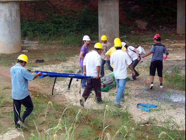 接下來(lái),對(duì)參演人員進(jìn)行角色分工和任務(wù)分配。所有參加演練的人員來(lái)到項(xiàng)目正在進(jìn)行的30米箱梁預(yù)制場(chǎng)門(mén)架附近待命。4點(diǎn)鐘,演練行動(dòng)正式開(kāi)始。項(xiàng)目負(fù)責(zé)人接到報(bào)告,K11+300水陽(yáng)江1#橋面施工區(qū)域發(fā)生高墜事故。由于水陽(yáng)江橋施工現(xiàn)場(chǎng)地處偏遠(yuǎn),距離主干道路和項(xiàng)目部及醫(yī)院都較遠(yuǎn),給自救和救援帶來(lái)嚴(yán)重考驗(yàn)。搶救疏散組及時(shí)啟動(dòng)《高墜事故應(yīng)急救援預(yù)案》,在以項(xiàng)目經(jīng)理為主的事故應(yīng)急救援領(lǐng)導(dǎo)小組領(lǐng)導(dǎo)下,各事故應(yīng)急救援機(jī)構(gòu)各司其職。搶救疏散組立即組織搶救受傷人員,將汽車(chē)、設(shè)備、救護(hù)人員派到事發(fā)地點(diǎn),并對(duì)現(xiàn)場(chǎng)人員進(jìn)行疏散隔離。救護(hù)人員第一時(shí)間對(duì)高墜傷者進(jìn)行了初步檢查,判定傷者暫時(shí)沒(méi)有生命危險(xiǎn),并對(duì)其發(fā)生骨折的右上肢進(jìn)行了夾板保護(hù),在搶救疏散組的協(xié)作下,傷者立即通過(guò)擔(dān)架進(jìn)行轉(zhuǎn)移,送往醫(yī)院。