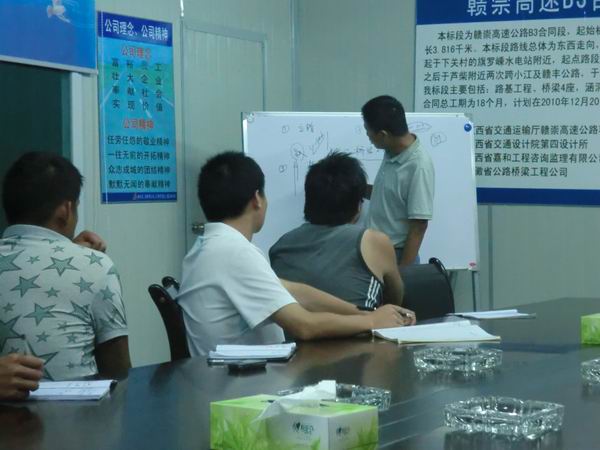 項目總工代聲慶詳細(xì)講述了橋梁施工過程中的各個環(huán)節(jié)及注意事項,根據(jù)實際施工情況,通過板書、畫圖等方法,如同把施工現(xiàn)場搬到了講臺,給新員工進行了細(xì)致全面的講述。項目經(jīng)理張春濤,根據(jù)自己多年的施工經(jīng)驗,提出了許多寶貴意見,并分發(fā)了《工地建設(shè)標(biāo)準(zhǔn)》及《規(guī)范化施工標(biāo)準(zhǔn)》兩本施工用書,希望新員工能把學(xué)到的知識運用到實際工作中去。